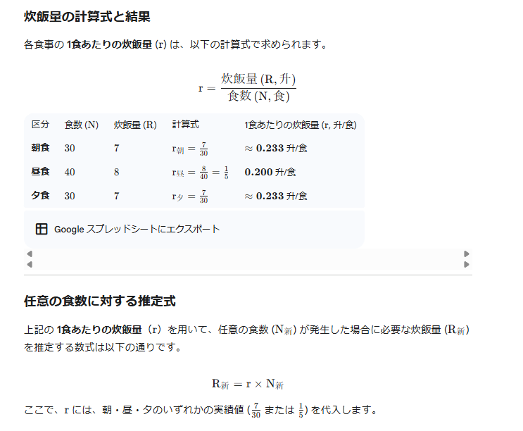 食事数量から、炊くごはんの量(升)を出力しています。