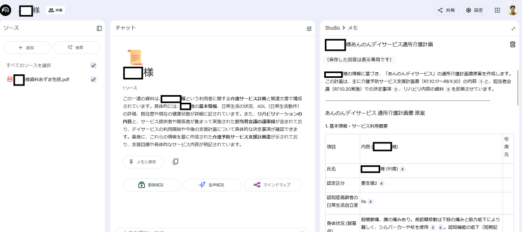 ちなみに先日担当者会議した方の音声データをNotebookLMにいれ、、、、