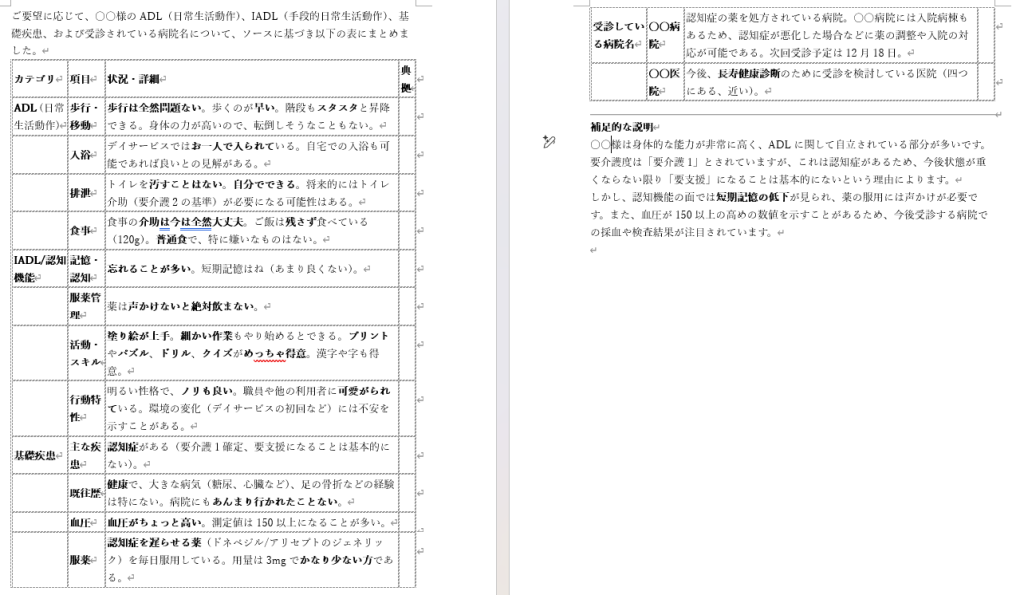 プロンプトで「ケアプラン原案作成」と入れたところ、なんと、内容をサマリしてくれました。