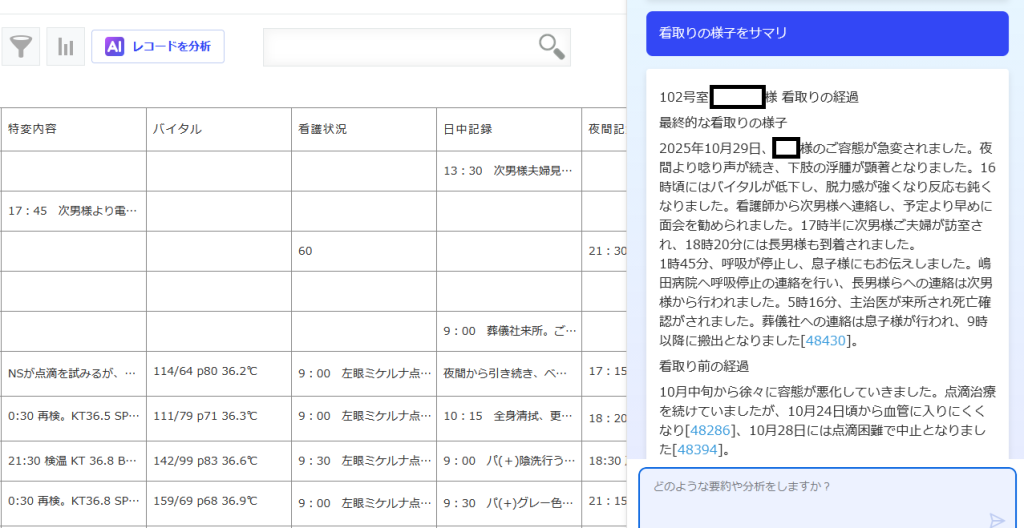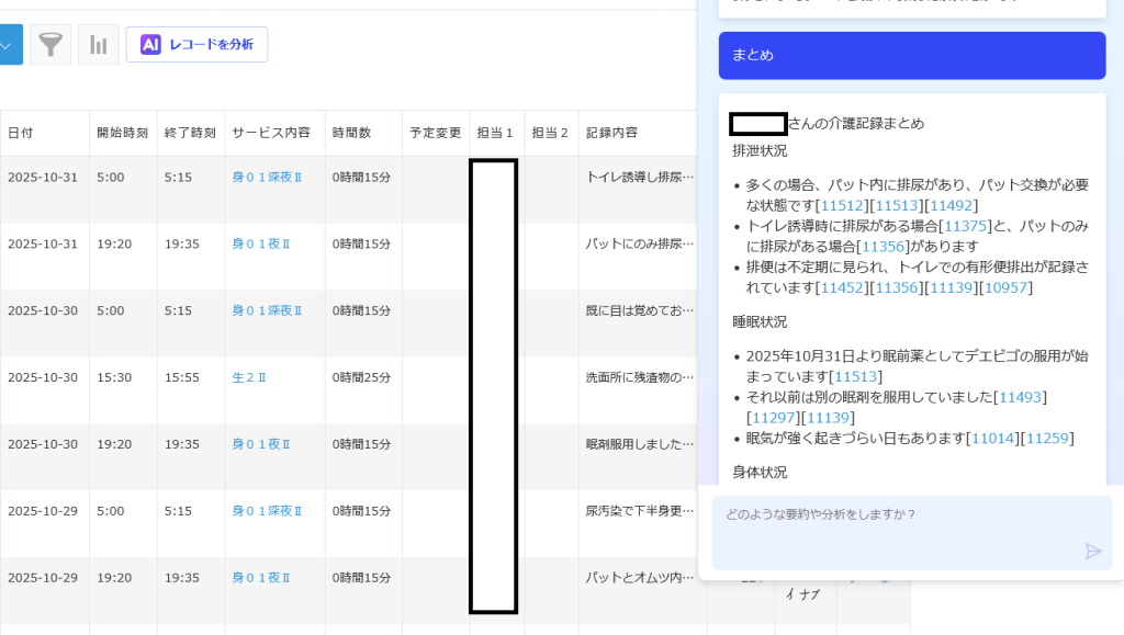 例えば「利用者名が〇〇〇〇さんだけをまとめ」としてもサマリを作成してくれます。