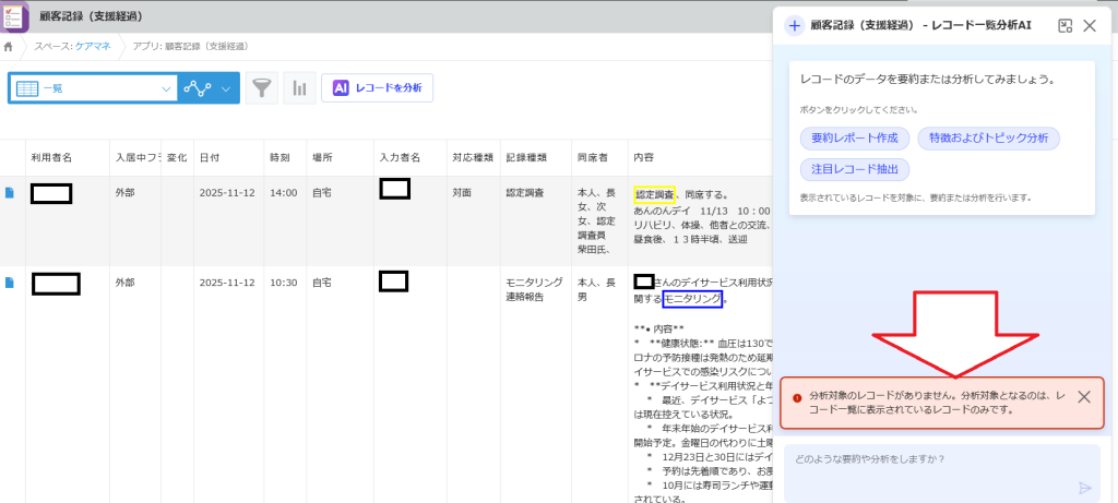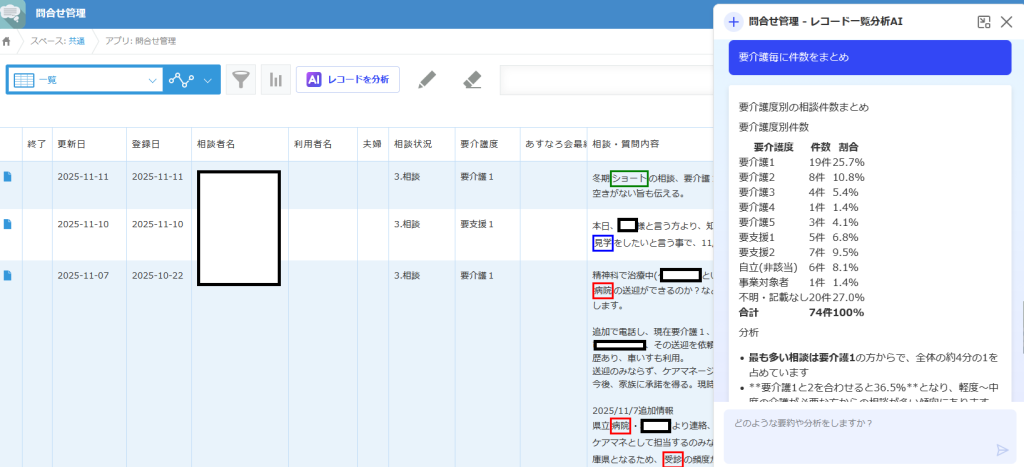 とりあえずAIに流す、kintone AIラボで実装された各AIがすごい。特にレコード一覧分析AIを介護の現場で使ったら、ケア記録、訪問介護実績、入居問合せ管理が秀逸!、困ったら「詳細」と入れればOK。No5994