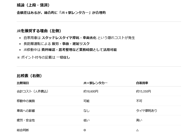 JRとレンタカーを利用した場合、駅レンタカーを利用すると、JR東が20%割引になり、レンタカー費用が10%割引となるこの場合の自家用車で行く場合とJRで行く場合の比較をしてください。駅レンタカーの車種は1番小さいコンパクトサイズで最低金額が6時間で6300円とする。また駅東駐車場で1200円の駐車料金が発生する。