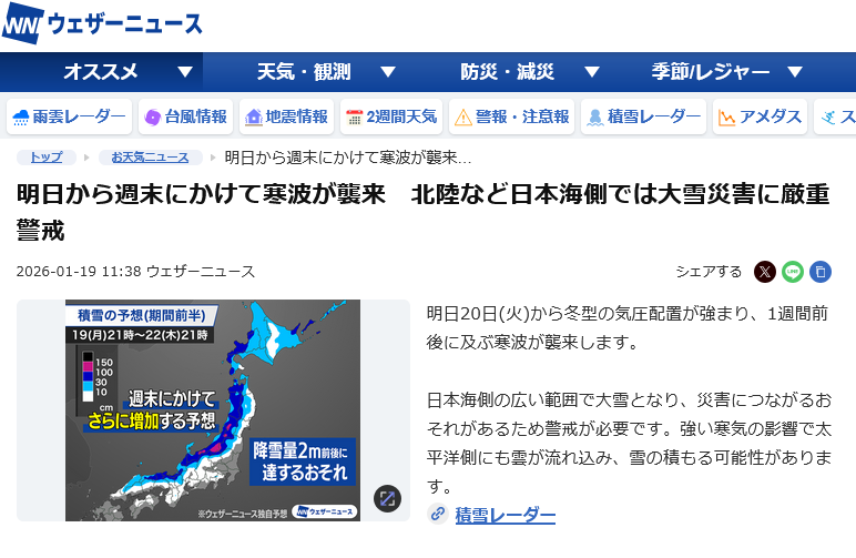 ・事前予測(天気予報): 2月4日頃からの寒波と大雪は、気象庁や民間気象会社により事前情報が発表されていました。3日〜8日にかけて強い冬型の気圧配置が続くことが見込まれていました。