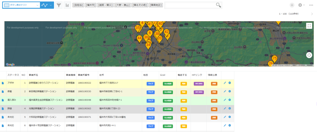 福井市や鯖江地区といった一覧を作っておいて、上部に絞り込みをかけられるように、
